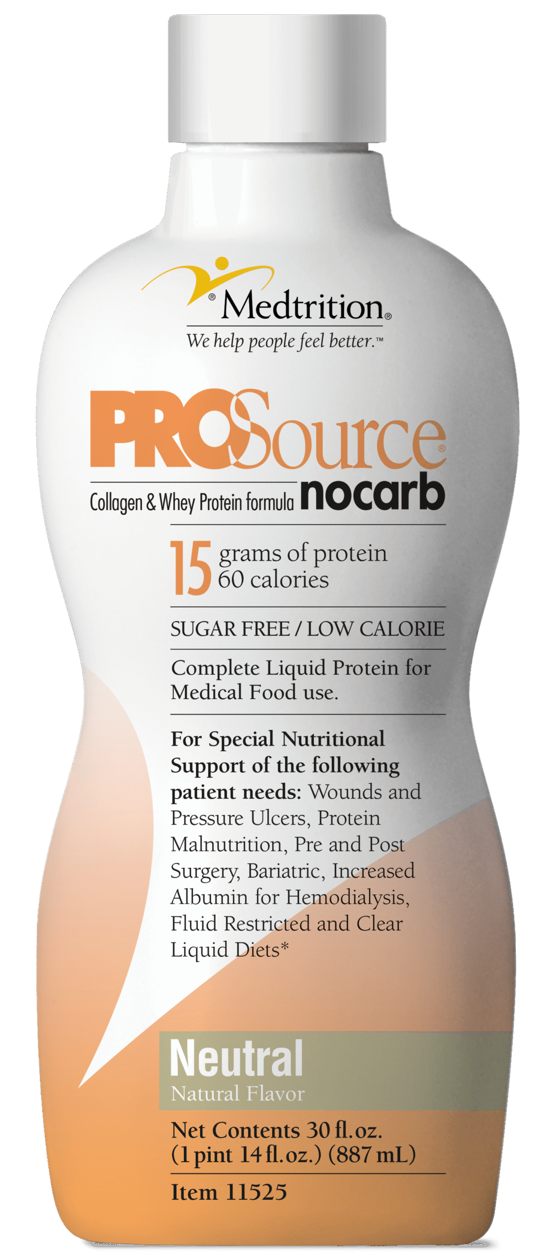 ProSource® NoCarb proporciona 15 gramos de proteína, 60 calorías por 30 ml y el 100% de aminoácidos esenciales, no esenciales y modificados.